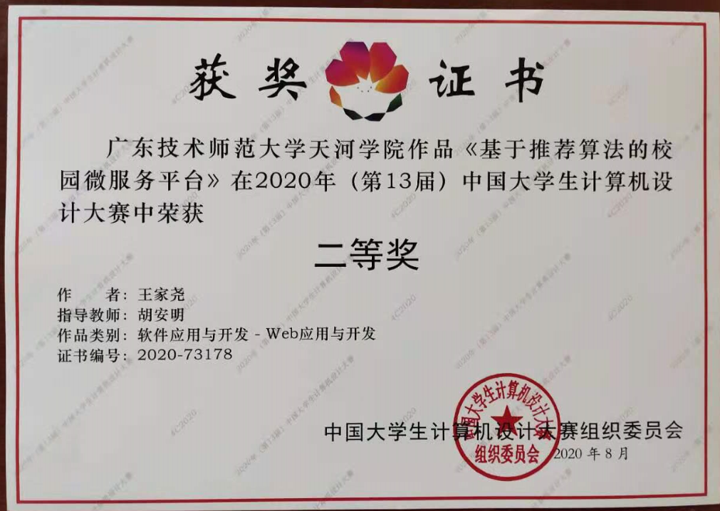 工作室自成立以来,积极地开展校企协同、产学研相结合的教学模式的探索,师生团队在教学科研等多个方面都取得了较好的成绩,工作室教师陈惠娥获2018年全国应用型课程建设说课竞赛一等奖,科研方面工作室获授权专利5项,软件著作权3项;发表论文5篇,主编教材2部;工作室学生团队也通过参加大学生创新创业项目申报、“互联网+”大学生创新创业竞赛、攀登计划等项目参与到科研与学科竞赛工作中来,多次在国家级、省级学科竞赛上斩获奖项;其中,参加 2019年、2020年中国大学生计算机设计大赛国赛获二等奖、三等奖,参加2018年中国软件杯获三等奖、近三年参加蓝桥杯大赛分别获得广东省一等奖、二等奖、三等奖多次,参加挑战杯全国大学生科技作品赛获广东省三等奖。