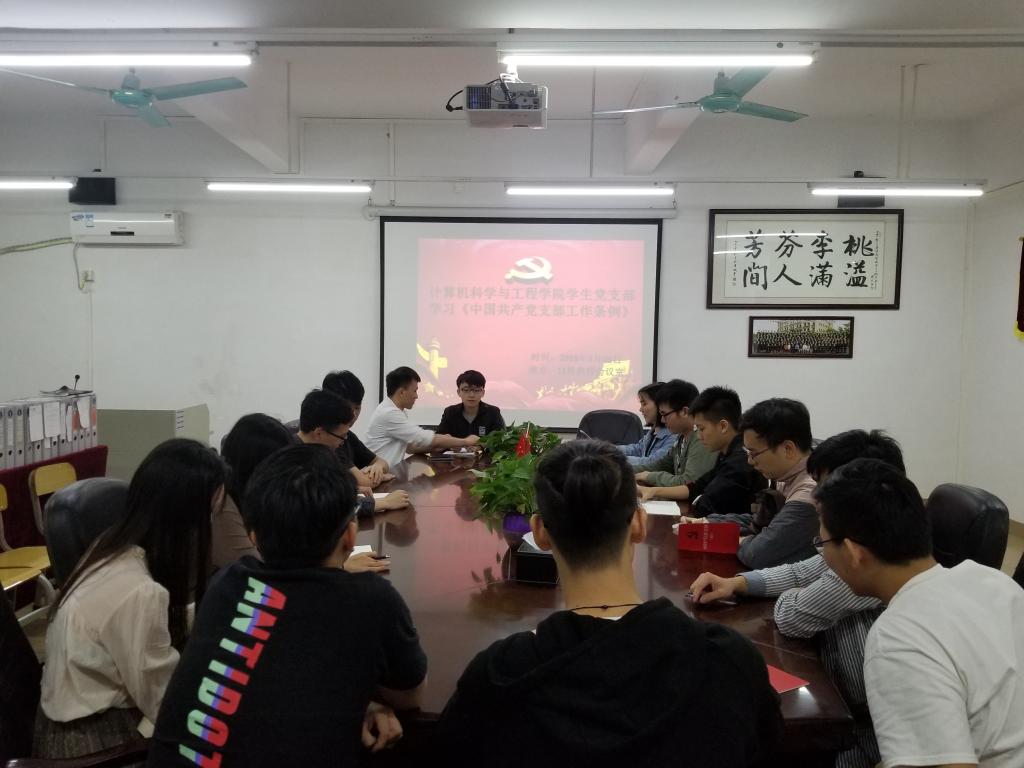 (通讯员 范明娟)5月5日,计算机科学与工程学院学生党支部在11栋302组织学习《中国共产党支部工作条例》(试行)相关内容,深入贯彻学习党的十九大精神,持续深化“维护核心、铸就忠诚、担当作为、抓实支部”的责任意识。支部副书记张伊凡主持学习活动,全体学生党员参与学习。