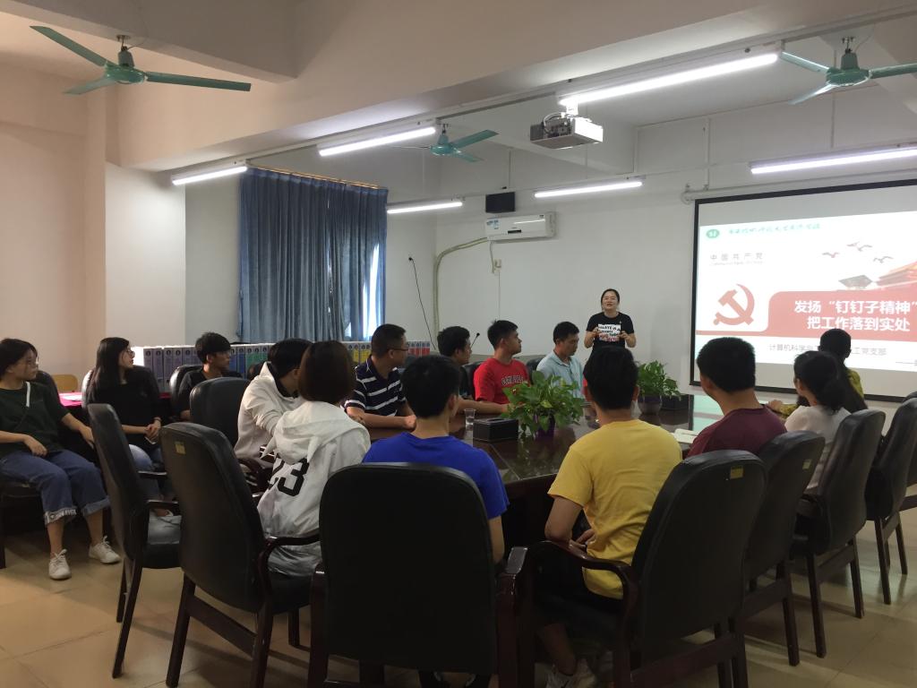 为了积极响应学校“不忘初心,牢记使命”主题教育“五个一”的工作安排,10月24日下午,计算机学院教工党支部副书记陈星莹总结了前期学习和调研成果,给所在学院师生党员讲授了一节《发扬“钉钉子精神”、把工作落到实处》为主题的党课。计算机学院教师党员和院团总支学生会主席团的党员学生干部参加了本次学习。