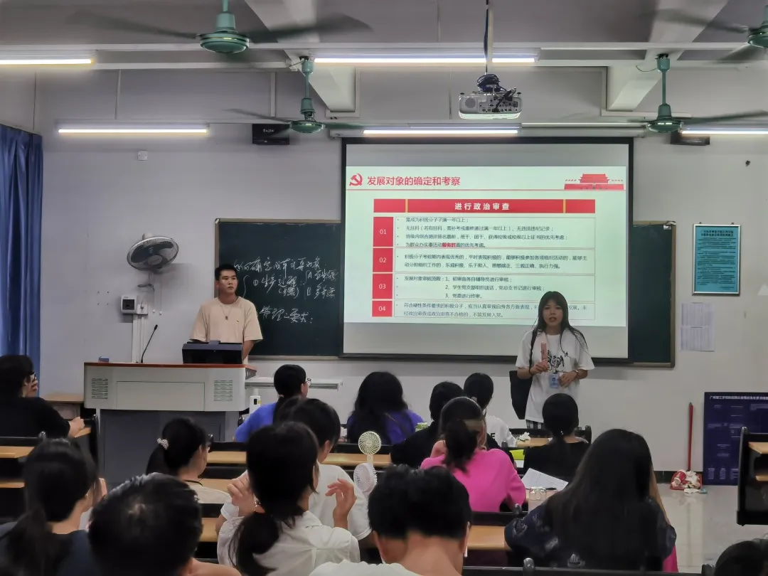 接着,党支部各党员同志向同学们细心讲述了入党的具体流程,其中包括自愿提出入党申请、确定为入党积极分子、进入考察期、听取党内外群众意见、团组织“推优”、确定为发展对象、政治审查等18个具体步骤,期间同学们认真聆听,并做好笔记,有关具体的申请步骤同学们也提出了一些疑惑,党员同志们也积极去为他们排惑。