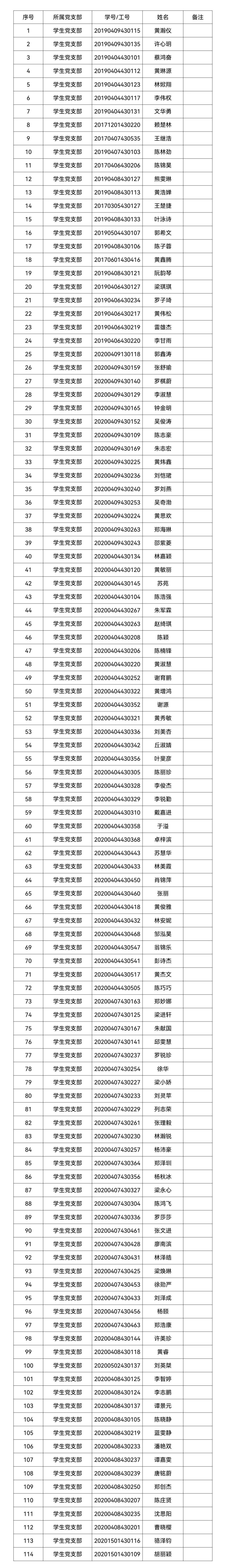 经党组织一年以上的培养教育和考察,黄瀚仪等114位同志被列为2022年第1期学生党员发展对象,党支部拟在近期召开党员大会讨论他们的入党问题。为了进一步增强发展党员工作的透明度,确保发展新党员的质量,根据《中国共产党发展党员工作细则》等文件的有关精神,现将发展对象名单公示如下,公示期7天,自2022年3月17日至2022年3月24日止。对他们的入党问题,如有异议,请于2022年3月24日前以书面形式并署真实姓名或移步信息楼309办公室,向党支部和上级党组织反映。