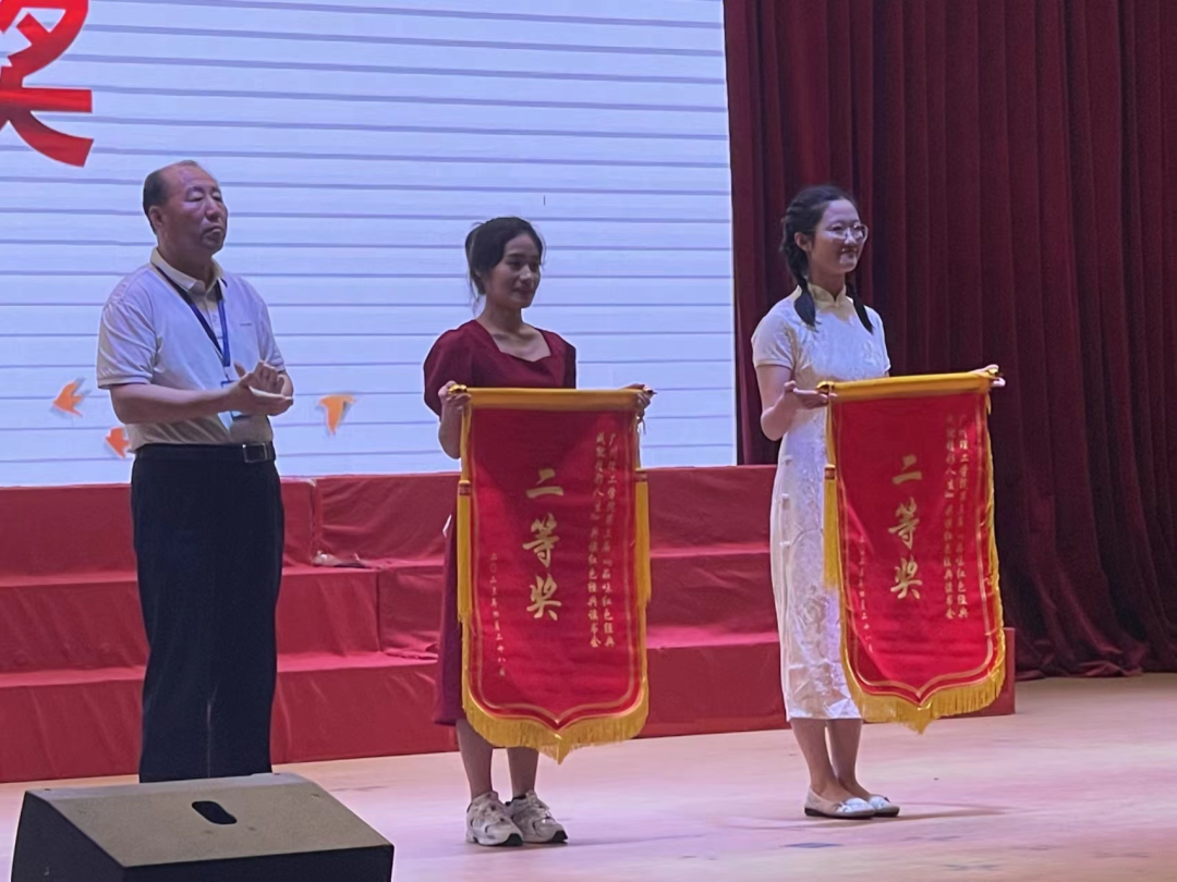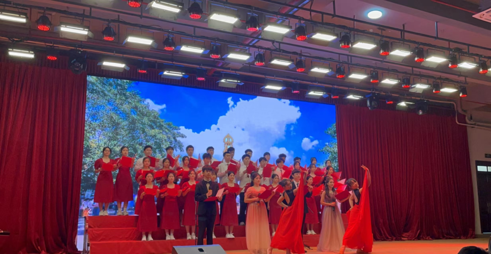 计算机学院代表队是由学院学生第三党支部统筹策划,其他学生党支部配合协助,从选人到训练再到比赛,从整体编排到细节设计,从前期朗诵人员的确定,到积极鼓励学院同学参与,党支部的师生都严谨认真的讨论、推荐与复盘,最终敲定41名师生组成朗诵队伍。经过数天日复一日的训练,在28日上午,大家精神饱满,女生身穿红裙,预示中国红;男生身着白衫,到台上很好地展示中华男儿英姿。台上大家齐颂《美丽中国》,以古朴雅韵的古筝为开端,以红袖飘飘的舞蹈为点缀,大家激情澎湃、热血激昂,颂出了对祖国的壮丽赞美,颂出了生在红旗下的幸福。最后,经过激烈的角逐和评委的打分,最终开云kaiyun体育官方网站朗诵队取得全校二等奖的佳绩!