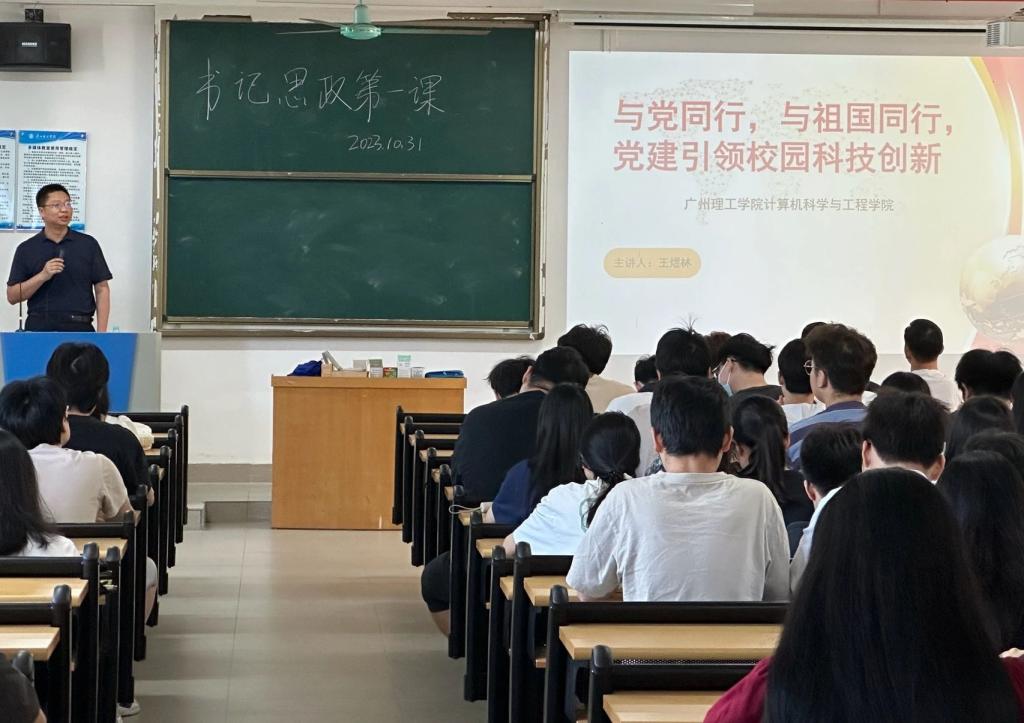 (通讯员:陈彩风)10月31日上午,计算机科学与工程学院教工党支部书记、“双带头人”王煜林于13栋401室讲授2023年秋季学期支部书记“思政第一课”。学院170余名21级专升本新生聆听了课程。
