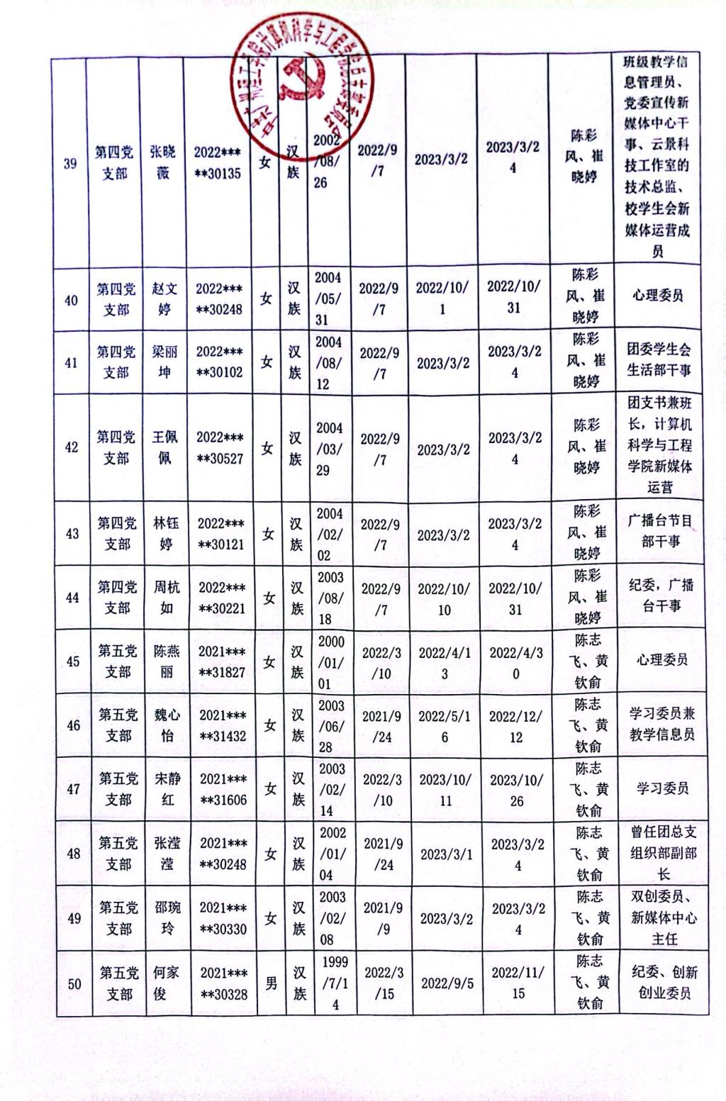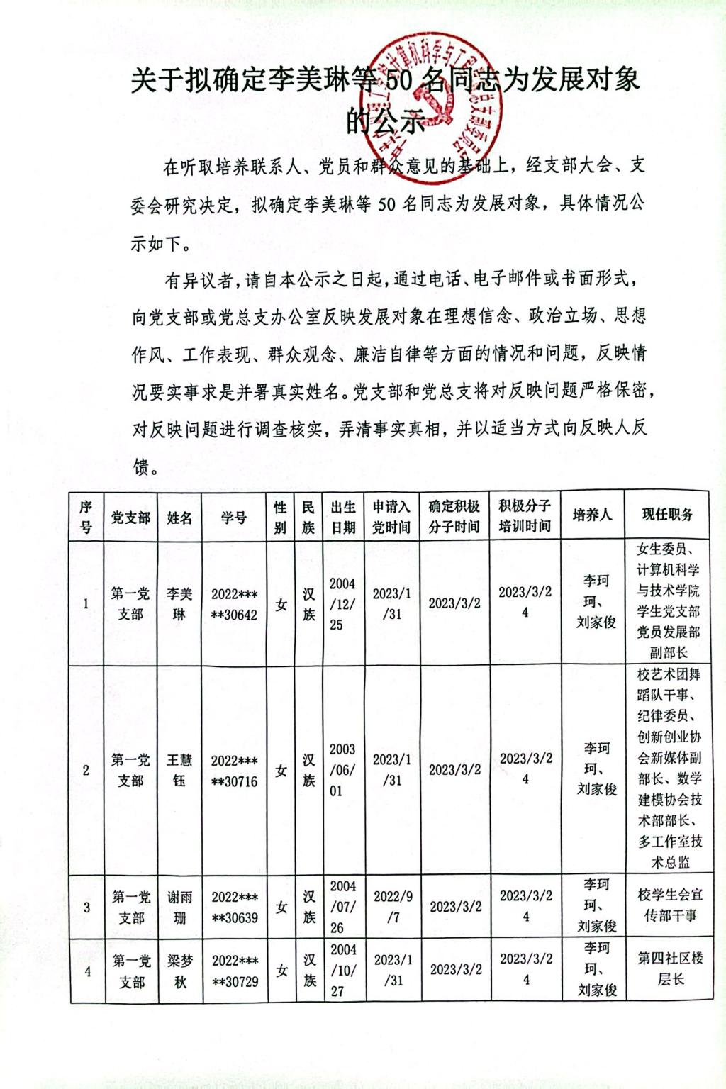 (通讯员:阳可人)在听取培养联系人、党员和群众意见的基础上,经支部大会、支委会研究决定,拟确定李美琳等50名同志为发展对象,具体情况公示如下。