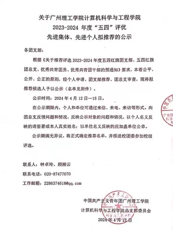 计算机科学与工程学院关于2023-2024年度“五四”评优先进集体、先进个人拟推荐的公示