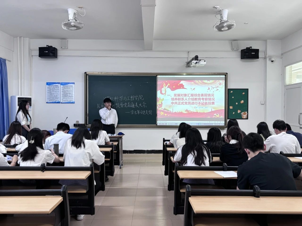 21位发展对象均发言完毕,由中共正式党员进行投票表决。该期21名发展对象名单上报学院党总支和校党委审议。随后,由学生第四党支部书记陈彩风同志宣读支部决议并作会议总结。