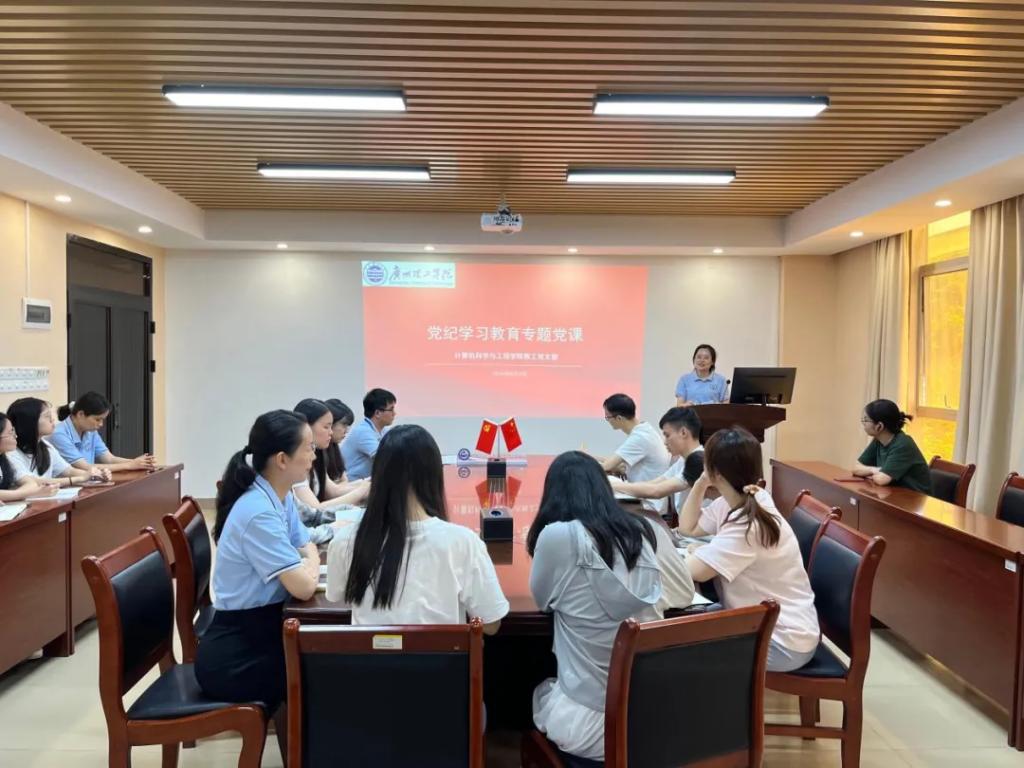 (通讯员:陈绪杨)6月11日下午,计算机学院教工党支部在会议室组织党纪学习教育专题党课,由党支部副书记陈星莹同志讲授。这是落实省委教育工委关于开展党纪学习教育的相关文件精神,旨在进一步加强学院教职工党员的党性教育,提高党员的政治觉悟和纪律意识。
