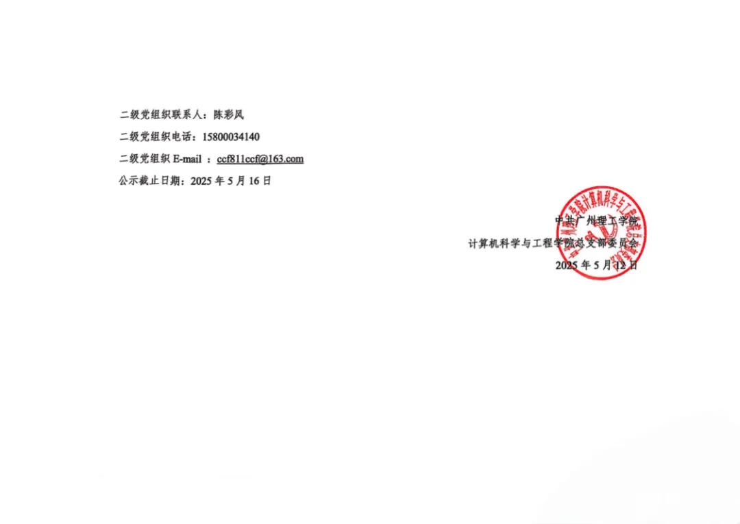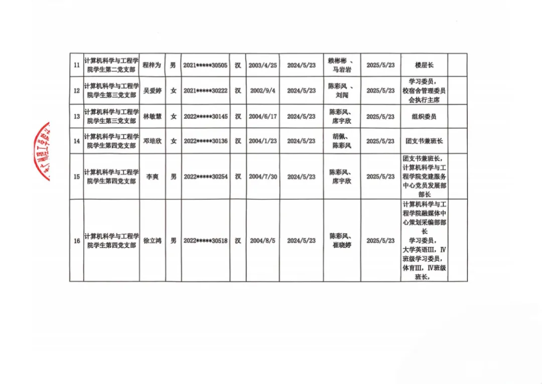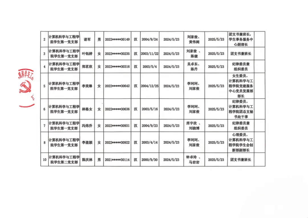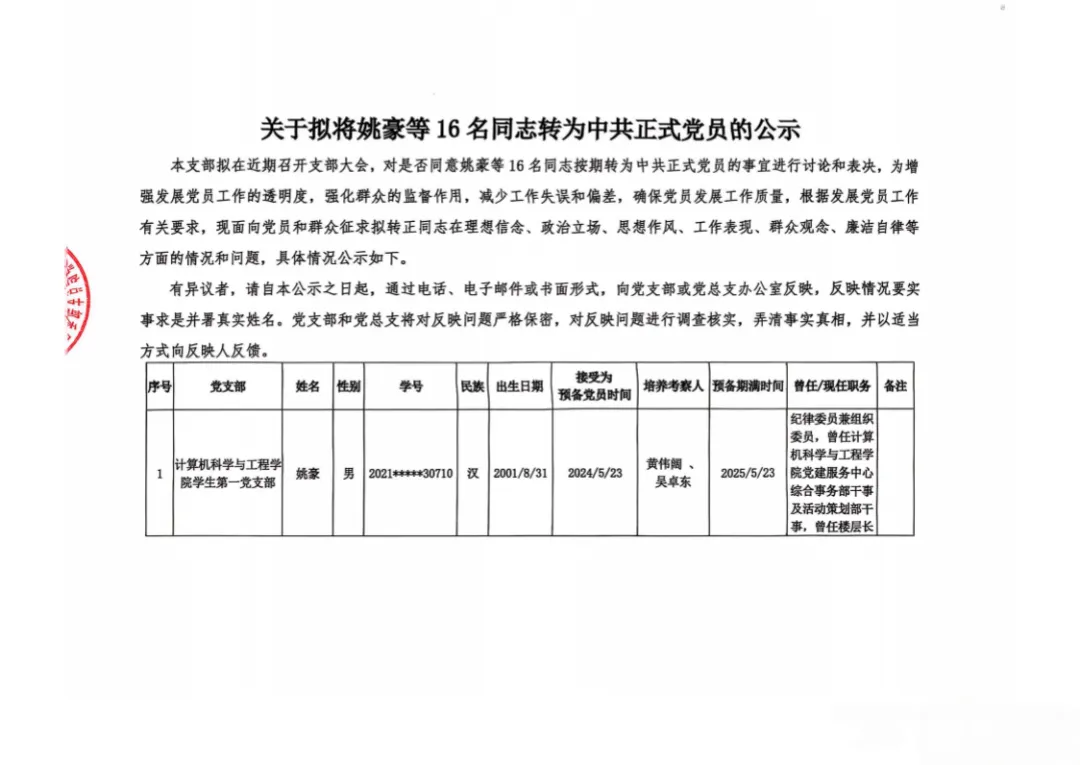 计算机科学与工程学院2024-1期预备党员拟转正公示