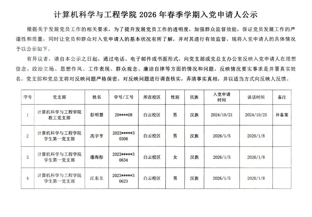 根据关于发展党员工作的相关要求,为了提升发展党员工作的透明度,加强群众监督效能,保证党员发展工作的严谨性和质量,同时让党员和群众对入党申请人的基本状况有所了解,并对其进行有效监督,现将入党申请人的具体情况予以公示如下。