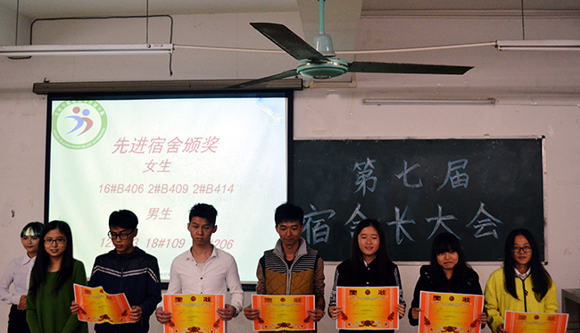 首先,由学生会张泳副主席为本次大会致辞。他希望各宿舍长能够积极配合,一起管理好宿舍。随后,全体人员观看以“宿舍的安全与卫生”为主题的教育短片,短片中的有奖竞答环节更是带动了现场的气氛。通过评比,有六间宿舍获得“先进宿舍”称号,并由团总支刘嘉薇副书记为获奖宿舍代表颁奖。大会尾声,由先进宿舍代表上台发言。