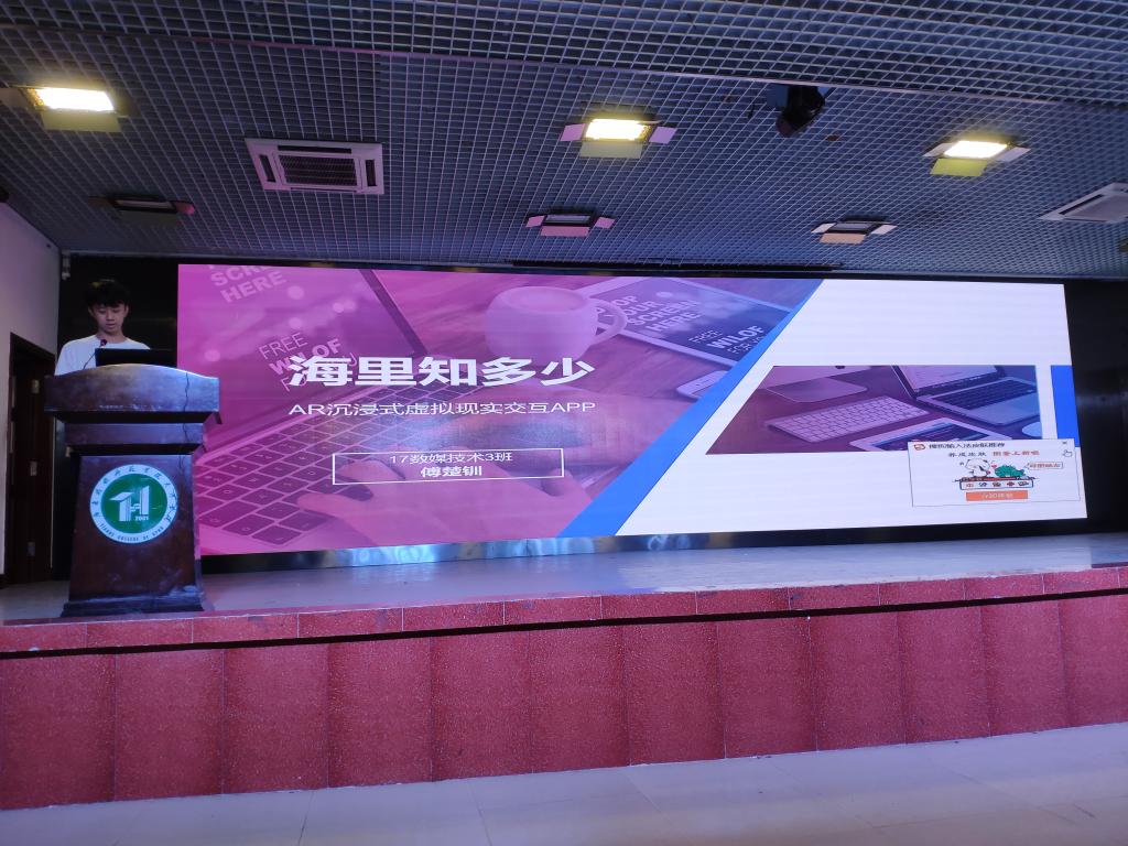 经过层层选拔,共有11组参赛选手入围本次大赛。参赛同学们分别结合专业特点,从室内设计方案、程序设计、网站设计和语音技术等多个角度展示所学的知识。17数媒技术3班傅楚钏同学带来的团队合作的AR作品《海里知多少》设计最能体现专业能力,获得本次大赛的一等奖。该作品是关于科普地理和海洋知识及化学生物类实验等相关内容的科普型APP。通过运用PS、3dsmax、Unity等软件设计而成,它拥有扫描卡片达到手机显示虚拟3D模型的功能,带有摄像头的手机和平板设备皆可使用。这款APP声像结合,丰富感官,对儿童具有启蒙教育作用。