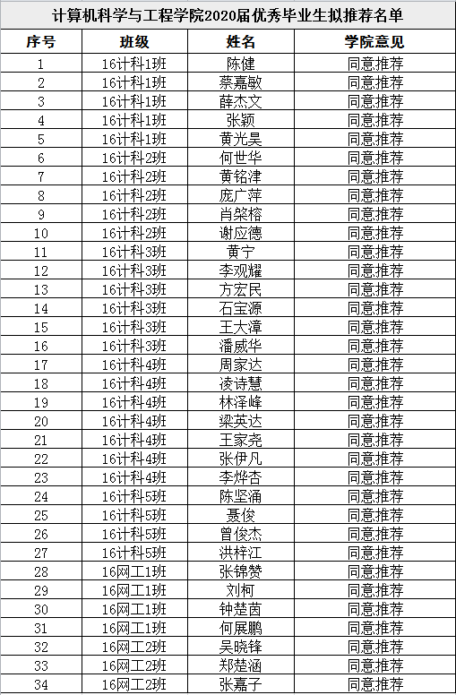 根据天院办〔2020〕18号《广东技术师范大学天河学院办公室关于评选2020届优秀毕业生的通知》,按照优秀毕业生评选办法,经学院初审,计算机科学与工程学院拟推荐陈健等34名同学为2020届优秀毕业生。现对拟推荐的优秀毕业生名单进行公示,公示期为2020.06.05-2020.06.09。公示期间,如对此结果有异议,请实名书面或者电话向学院党总支办公室反映,不签署真实姓名以及不提供具体事实材料的不予受理。