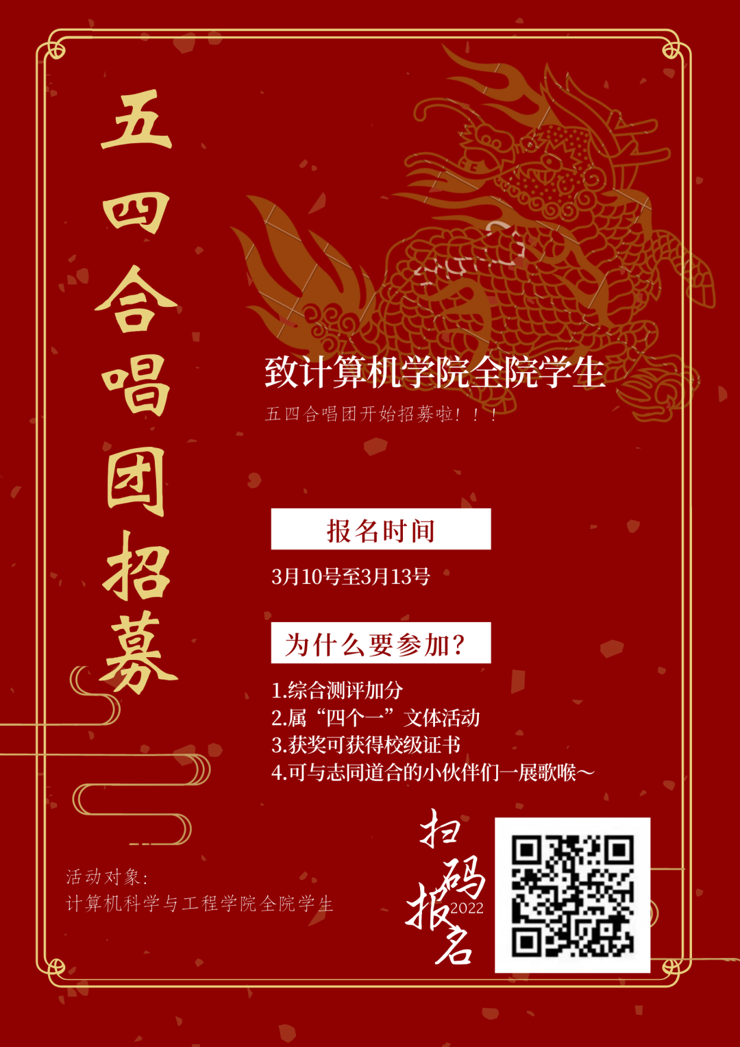 (通讯员:黄炜鑫)经历了一百多年的春秋轮回,一代又一代的青春在接力,接力青春的涌动、接力青春的呐喊、接力中华民族“爱国、进步、民主、科学”的爱国主义精神。开云kaiyun体育官方网站现正积极准备学校五四大合唱比赛,现特向全院师生招募计算机科学与工程学院合唱团成员。