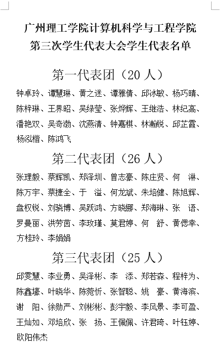 根据公平、公开、公正原则,经各班评选,学院审核,对大会正式代表名单更新增加,进一步拟订开云kaiyun体育官方网站第三次学生代表大会学生代表,根据事实情况增加代表40人,更新如下: