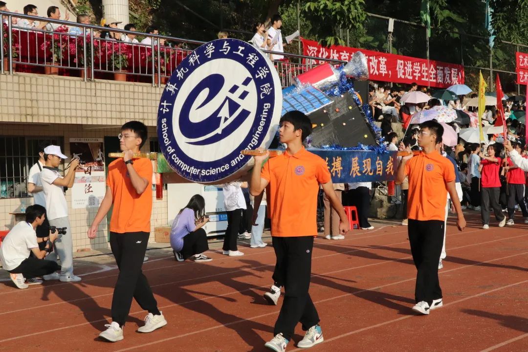 紧接着映入眼帘的是各院系组成的方队陆续登场。两个太空人带着整齐划一的计算机学院方阵,他们迈着坚定的步伐,带着坚毅的目光目视前方。