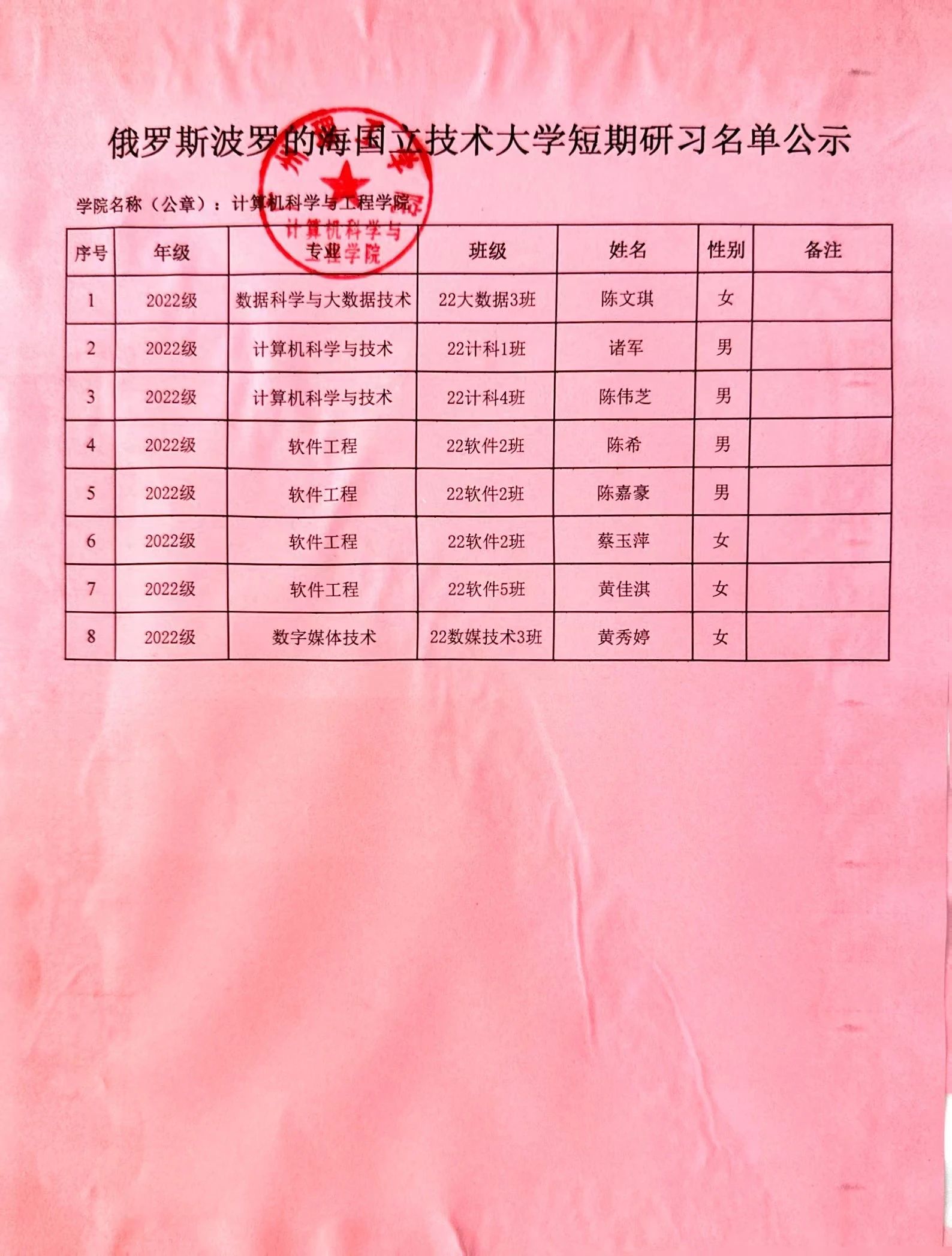 根据学校《关于选派优秀学生赴俄罗斯波罗的海国立技术大学短期研习的通知》的文件精神,“学生个人申请,二级学院审核推荐,按照公平、公开、公正的原则,现将评比结果予以公示,公示期为2023年11月9日至11月11日。若对公示有异议,请以书面形式向以下受理部门反映,反映情况时请署名真实姓名和联系电话,不签署真实姓名或不提供具体事实材料的,将不予受理。