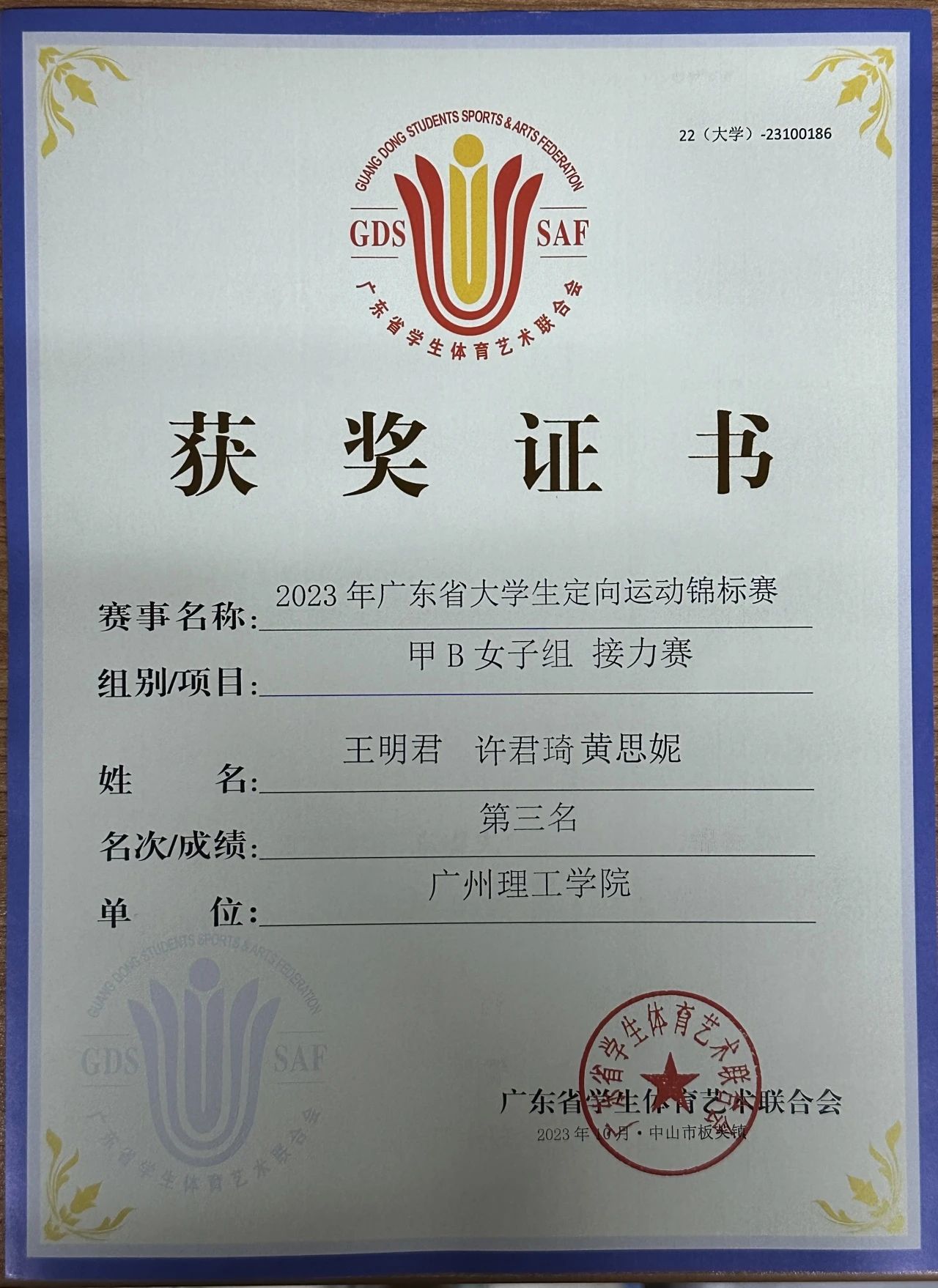 (通讯员:席宇欣)在这个阳光明媚的金秋,2023年广东省大学生定向运动锦标赛于10月27至29日在中山市板芙镇举行。开云kaiyun体育官方网站22大数据3班许君琦、22计科9班甘镇东、22大数据3班吴晓森、22数媒技术3班蔡传权参与本次赛事,凭着自我的坚强意志和顽强拼搏的勇气,最终许君琦同学协队友王明君、黄思妮获得甲B女子组接力赛第三名的好成绩。
