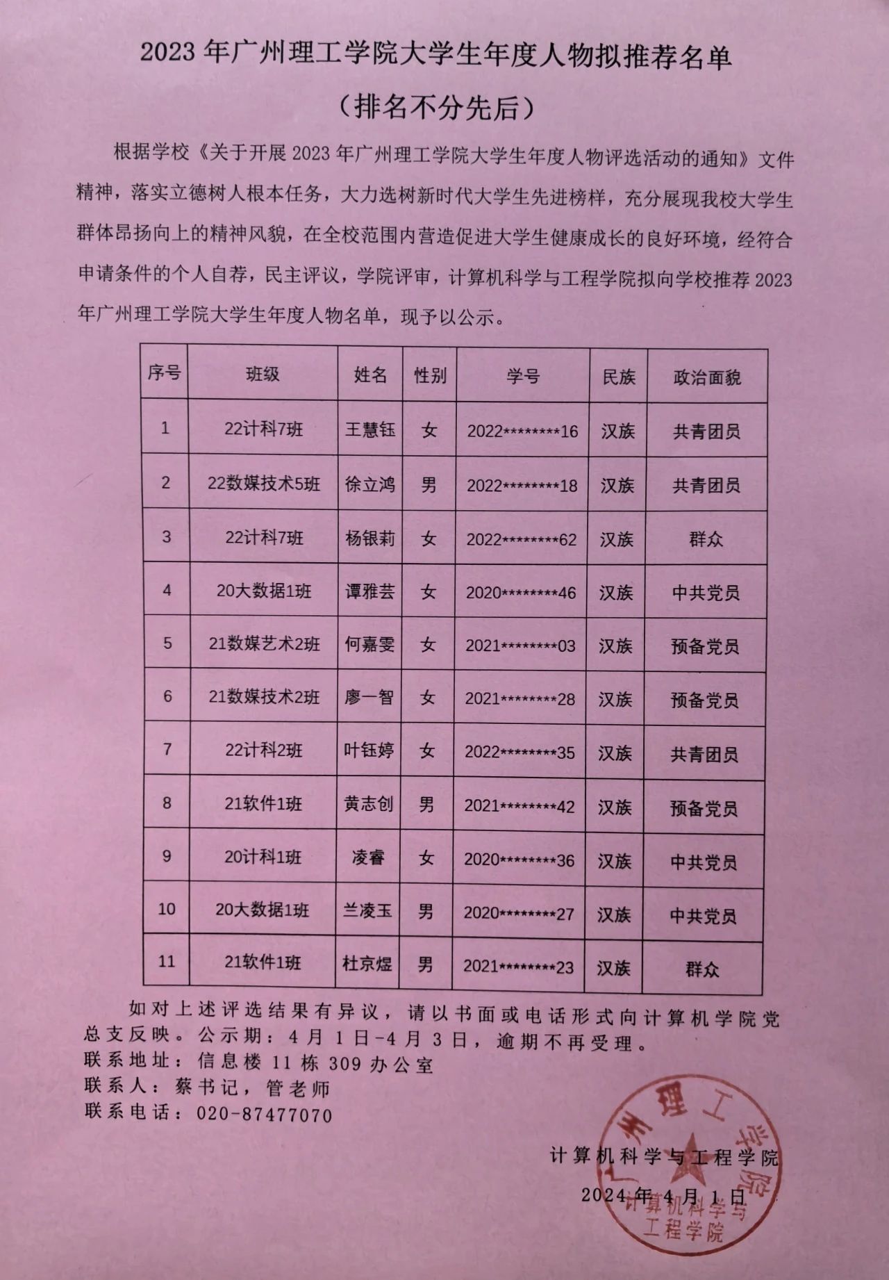 (通讯员:管晨)根据学校《关于开展2023年广州理工学院大学生年度人物评选活动的通知》文件精神,落实立德树人根本任务,大力选树新时代大学生先进榜样,充分展现我校大学生群体昂扬向上的精神风貌,在全校范围内营造促进大学生健康成长的良好环境,经符合申请条件的个人自荐,民主评议,学院评审,计算机科学与工程学院拟向学校推荐2023年广州理工学院大学生年度人物名单,现予以公示。