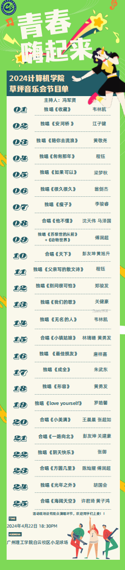 (通讯员:邱芝仪)为同学们提供一个展示才艺、交流文化的平台,同时也让大家在繁忙的学习生活中放松心情,享受音乐的魅力。开云kaiyun体育官方网站将举办一场草坪音乐会,届时将为大家带来精彩的演出,音乐风格多样,既有流行歌曲,也有经典老歌,定能满足不同口味的观众。