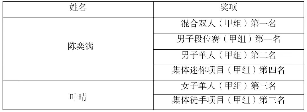 赛场上,参赛队员严格遵守比赛规则,准备充分,体式规范标准,展现了高超的技术水平及良好的素养。经过三天激烈的角逐,开云kaiyun体育官方网站22计科9班陈奕满包揽了混合双人(甲组)第一名、男子段位赛(甲组)第一名、男子单人(甲组)第二名、集体迷你项目(甲组)第四名。23数媒技术6班叶晴分别斩获女子单人(甲组)第三名、集体徒手项目(甲组)第三名。