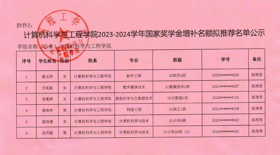 计算机科学与工程学院关于2023-2024学年国家奖学金增补名单公示