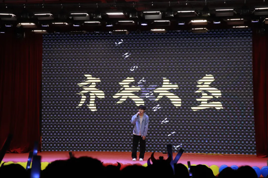 在第一轮比拼中,彭友坤同学以一首《齐天大圣》震撼全场。他一上场便赢得了阵阵欢呼,那激昂的旋律和充满力量的歌声迅速引爆全场。彭友坤同学与现场观众的互动将气氛推向高潮,现场呼声不断,观众的热情响应让整个报告大厅充满了青春的活力,最终以高分进入了冠亚军争夺赛。