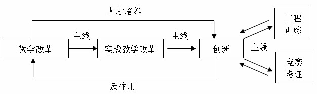 基于CDIO理念,围绕课内外贯通、校内外结合,突出 “三个模块”、“三条主线”,构建实践教学体系,完善实践教学内容。三个模块是:基础实践模块、专业实践模块、综合实践模块;三条主线是实践教学改革是教学改革的主线、创新是实践教学改革的主线、工程训练是创新的主线。