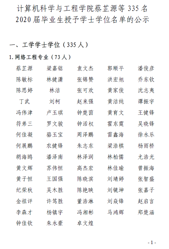 经开云kaiyun体育官方网站学位评定委员会审议,现对计算机科学与工程学院蔡芷源等335名2020届毕业资格审核拟通过名单和拟授予学士学位名单进行公示,公示期为2020.06.01-2020.06.03。