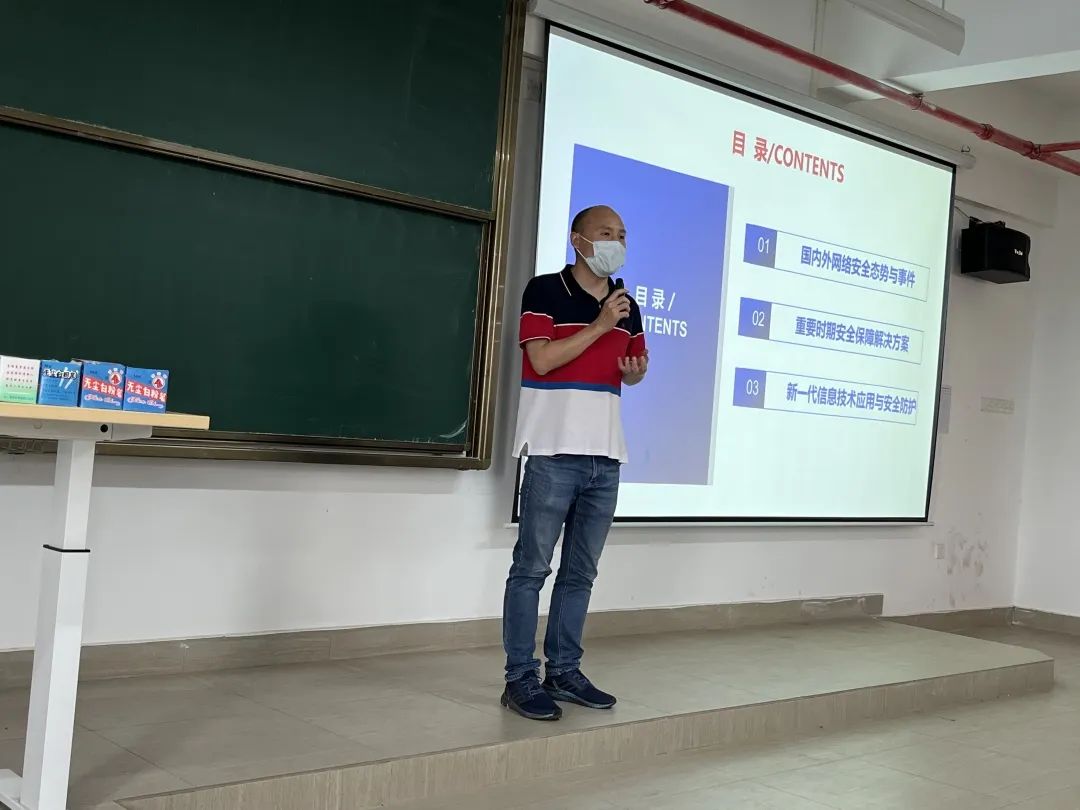 (通讯员:陈星莹)4月25日,开云kaiyun体育官方网站蓝盾网络空间安全学院组织了以“新一代信息安全技术应用与防护”为主题的网络安全专业讲座。本次讲座由蓝盾教育事业部技术总监石老师和教研室主任陈老师主讲,19、20、21级网工班全体学生聆听了讲座。