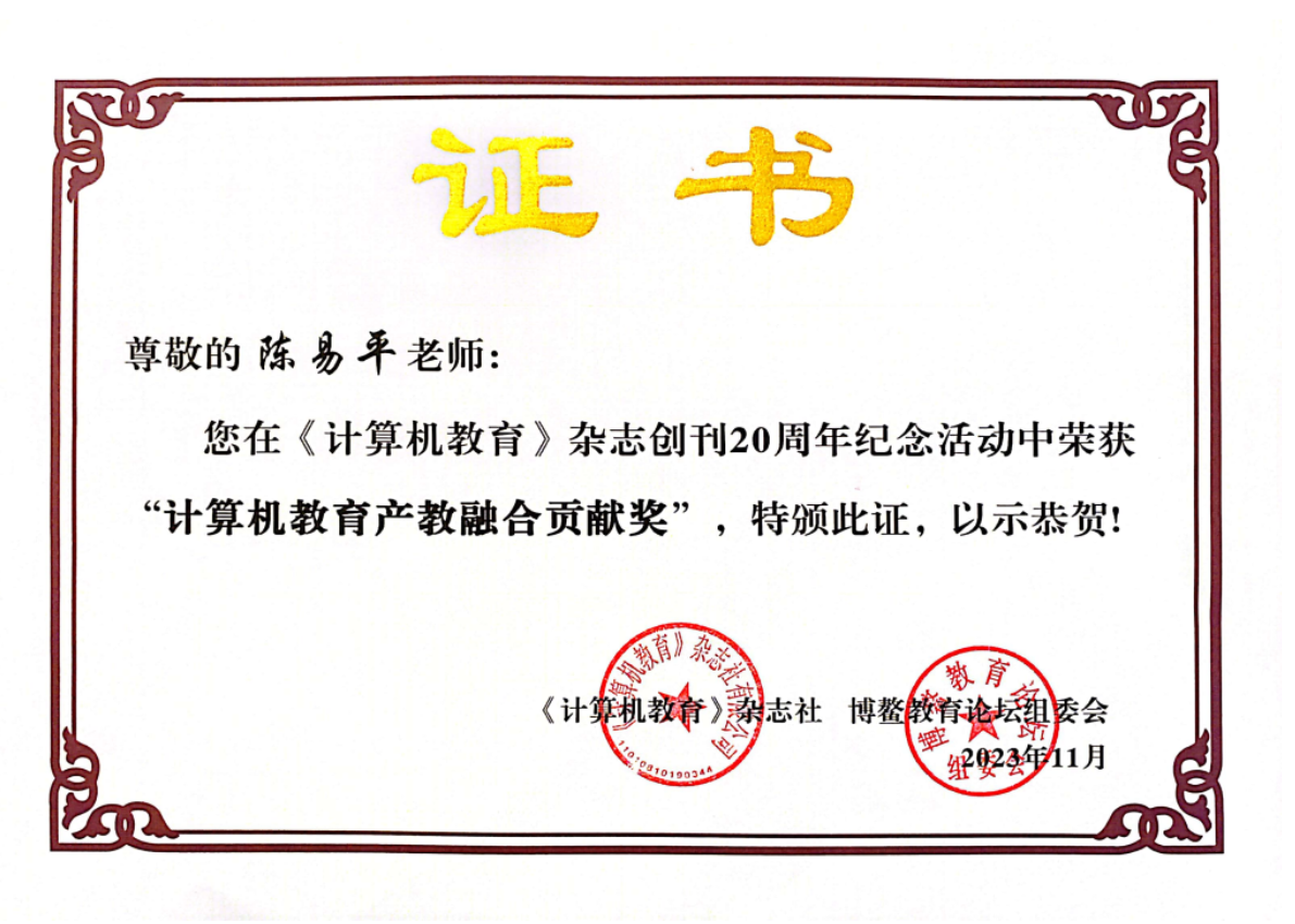 一直以来,计算机科学与工程学院坚持校企深度融合培养应用型人才。在美林大数据等多个公司的支持下,尝试了科教融合、训战育人、产业导师进课堂、共建名师工作室等多种校企联合育人模式。陈易平副院长分管学院实践教学和实验室建设工作,为探索人才培养新模式和产教融合工作作出了巨大贡献。此次陈易平副院长喜获“计算机教育产教融合贡献奖”,既是对其个人工作的肯定,也是对学院多年来深耕产教融合协同育人工作的认可。
