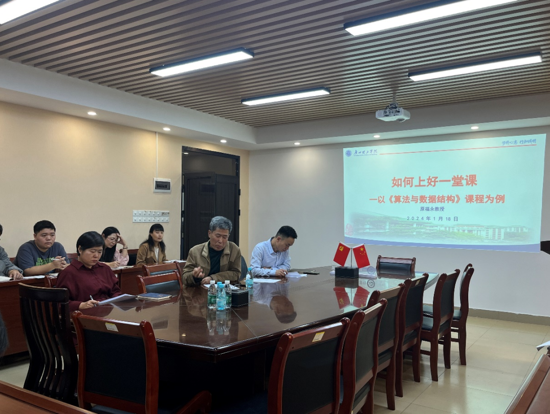 在讲座中,原福永教授深入浅出地阐述了如何上好一堂课的关键要素,并以《算法与数据结构》这门课程为例分享了自己多年来的教学经验。他指出在算法与数据结构课程教学中,首先应该让学生明确数据结构的实际应用,引发学生思考,激发学生的学习兴趣;其次,他强调了绪论对于课程教学的重要性,明确表示通过对绪论的讲解,来建立课程概念,为日后学习的连贯性打下基础。此外,原福永教授还就如何设计课程,如何把握课程重难点进行了详细的示范。另外,原福永教授就若干细节的处理给出了自己的个人理解与体会,还指出及时纠错的必要性,这不仅能够给学生一个认真读书的好榜样,还能在学生面前树立一定的权威。