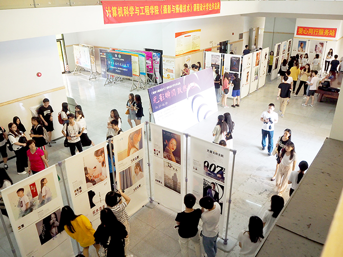 (记者:洪育丹)6月3日,计算机学院《光影瞬间,跃然纸上》课程设计学生作品展在11栋信息楼一楼大厅开幕。此次展示的作品是17级数字媒体技术专业的《摄影与摄像技术》课程实训结课作品。谭海鸥副校长和教务处、计算机学院领导出席开幕式。