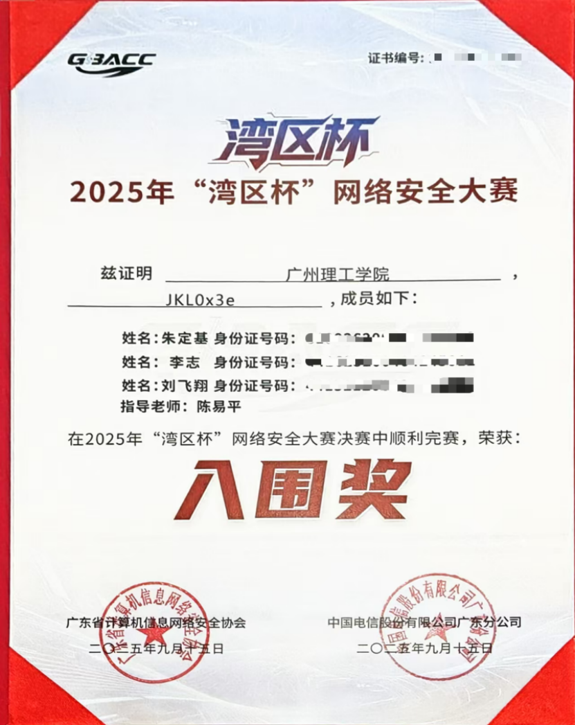 近期,2025年“湾区杯”“长城杯”两大全国性网络安全赛事相继落下帷幕。我校计算机科学与工程学院JKL0x3e战队在陈易平老师指导下,凭借扎实的技术功底与稳定的赛场发挥双线告捷,不仅晋级“湾区杯”全国决赛,更有队员斩获“长城杯‘安全卫士’称号”,充分展现了学校在网络安全领域的人才培养成效。