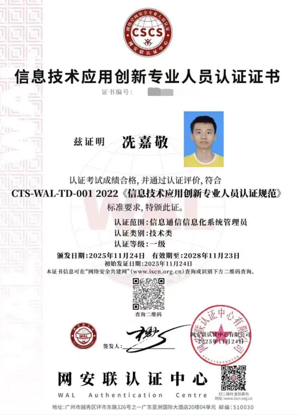 冼嘉敬同学荣获信息通信信息化系统管理员赛项三等奖