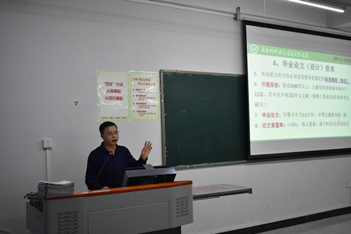 谌颃副院长主要给15级同学重点传达学校“2019届毕业论文(设计)手册”的要求,毕业论文(设计)的目的是为了培养学生综合应用所学知识,解决实际问题和初步进行科学研究的能力,培养学生的创新意识和实践能力,锻炼学生的文字与表达能力,也是衡量教学水平、审核学生毕业于学位资格的重要依据和必要条件,所以要求同学们要诚信、严谨对待,不能抄袭和应付了之。