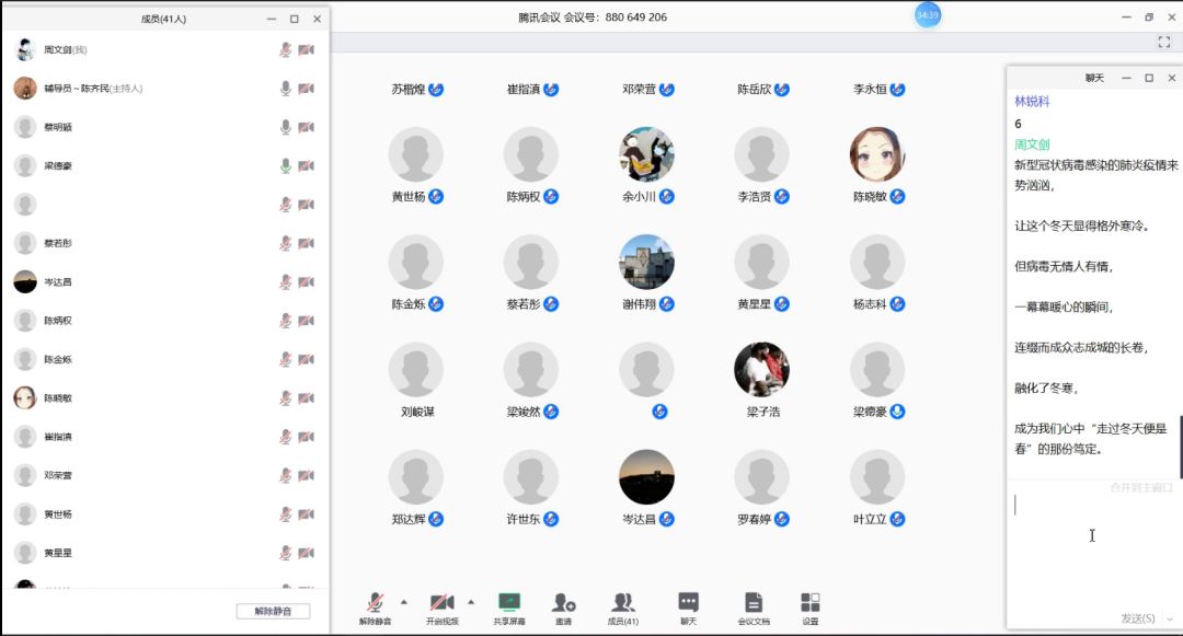此次线上主题班会开在我国抗疫攻坚的关键时刻,坚定了学院全体同学的抗疫信心,同时也让同学们感受到组织的关怀,相信在全民的共同努力下,我们一定可以战胜疫情,早日返校!(通讯员:彭嘉伟)