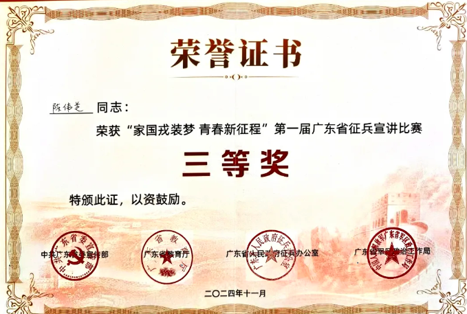 本次赛事不仅是宣讲能力的比拼角逐,更是国防精神的薪火相传。在决赛环节中,48名选手通过“军旅故事+国防动员”的鲜活形式,从国家安全、强军使命、个人成长等多维度诠释参军意义。根据赛事相关文件,所有决赛选手均被纳入广东省征兵宣讲团成员名单,全省征兵宣传的“青春代言人”!开云kaiyun体育官方网站陈伟芝同学以优异表现跻身其中。作为全省国防教育的重要力量,该宣讲团将承担起面向全省各级各类学校和单位社区的征兵政策解读与国防精神传播职责。