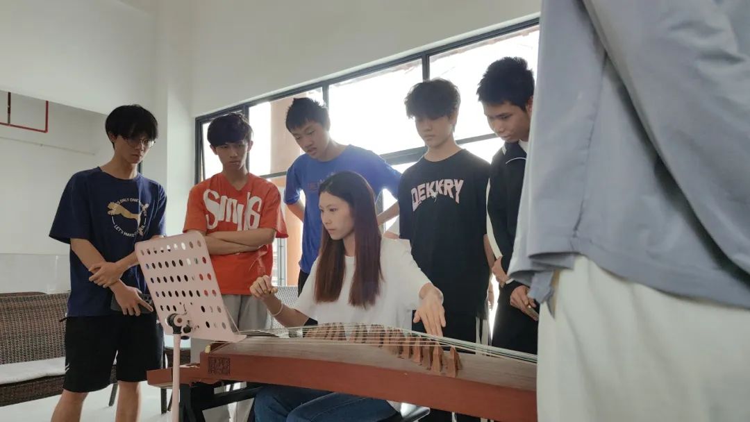 古筝教学中,刘知越同学聚焦传统乐器特点,讲解各琴弦对应的音名与音高、指甲佩戴等基础知识,随后刘知越同学现场演示《沧海一声笑》的弹奏技法。现场参与的同学们认真聆听讲解,积极学习,在刘同学的细心指导下,基本完成了曲子的演奏。活动最后,卢雯靖、刘知越同学分别弹奏了两首曲目,结束今天的音乐兴趣教学。
