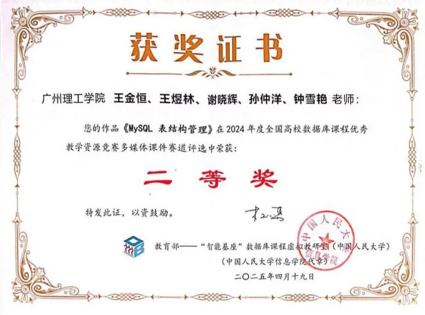 (通讯员:郑俊嫦)2025年4月18日至4月20日,由山西农业大学软件学院、CCF太原承办的教育部-华为“智能基座”数据库课程虚拟教研室2025年年会在山西农业大学举行,本届年会以“大模型智启数据库教学新范式”为主题,我校计算机科学与工程学院校级一流课程《数据库原理及应用》负责人王金恒老师应邀参加本次年会,由王金恒、王煜林、谢晓辉、孙仲洋、钟雪艳教师团队共同撰写的多媒体课件《MySQL表结构管理》荣获全国高校数据库课程优秀教学资源竞赛二等奖。