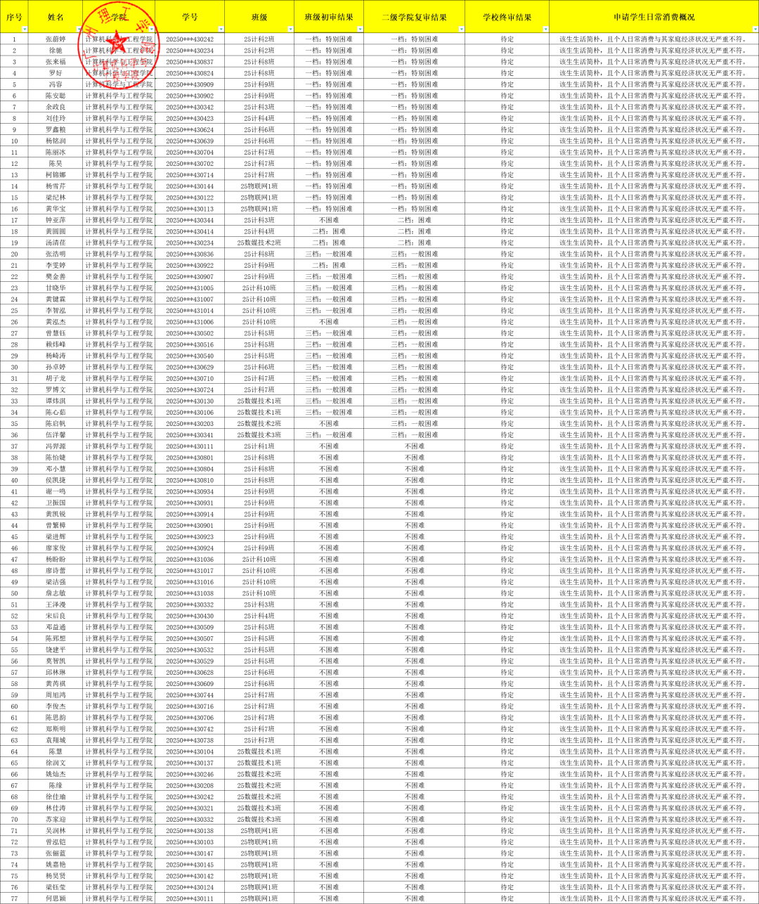 本次公示内容包括学院初审认定的家庭经济困难学生名单及其认定等级。具体名单如下。