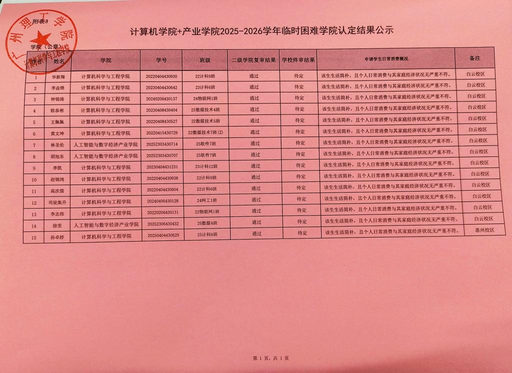 计算机学院和产业学院2025-2026学年秋季学期临时困难补助结果公示