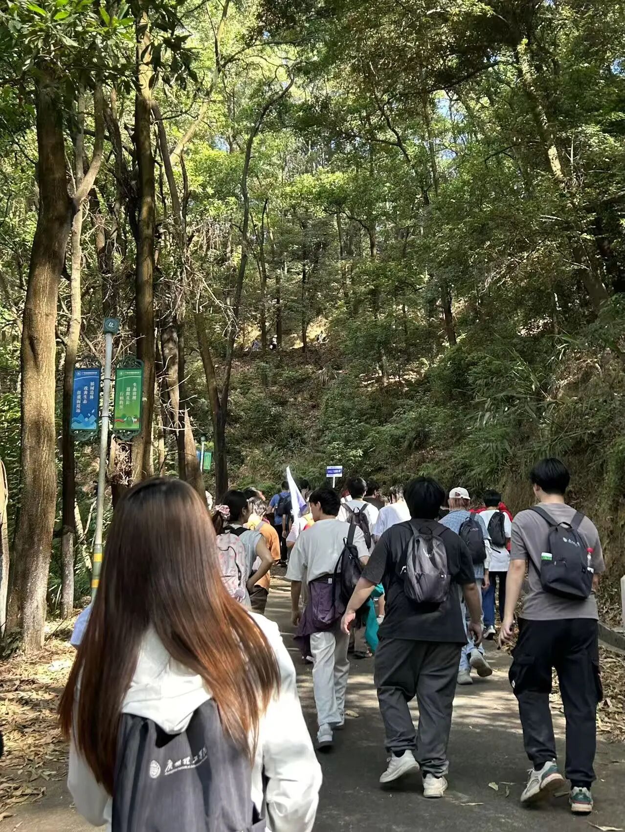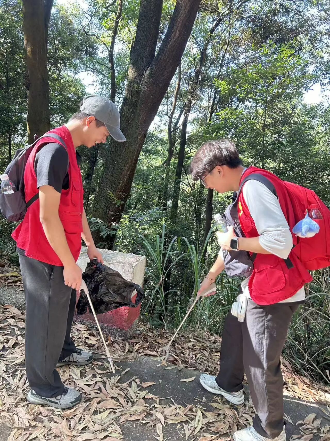 徒步途中,同学们还化身环保志愿者,用行动践行责任担当。有人弯腰捡拾塑料瓶与废纸,有人细心清理落叶枯枝,有人将分类好的垃圾妥善收纳,有序地开展环保行动,以实际行动守护绿水青山。