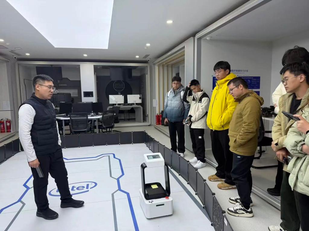 现场,师生们还体验了企业自主研发的 AI + 教学实验平台,通过硬件搭建与算法调试,完成了智能系统原型开发,实现了从理论知识到工程能力的转化。 随后在企业的AI实训基地,技术人员现场展示了自主移动机器人的动态避障功能。该机器人搭载Intel技术平台,并采用模块化硬件设计,使师生们能够直观地了解智能装备的技术架构和工程实现逻辑,为后续竞赛课题的硬件优化提供了实操参考,助力师生攻克竞赛技术难点。