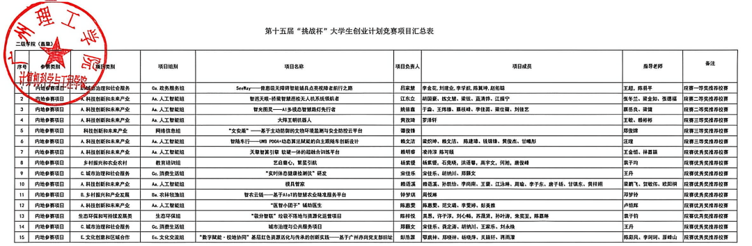 根据《关于举办第十五届“挑战杯”广东大学生创业计划竞赛校内选拔赛的通知》相关要求,计算机学院积极组织学生参与,各班级踊跃上交申报作品。经过组织初审——班赛推优——学院评审等环节,最终从180份作品中选拔出以下15份作品推荐参加校赛。现将推荐参加校赛作品名单及相关信息进行公示。