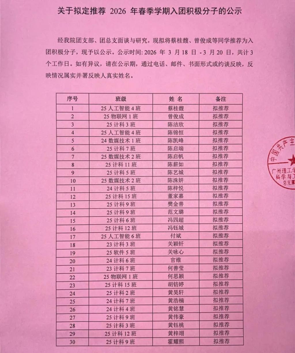 经开云kaiyun体育官方网站团支部、团总支面谈与研究,现拟将蔡桂馥、曾俊成等同学推荐为入团积极分子,现予以公示。公示时间:2026年3月18日-3月20 日,共计3个工作日。如有异议,请在公示期,通过电话、邮件、书面形式或约谈反映,反映情况属实并署反映人真实姓名。